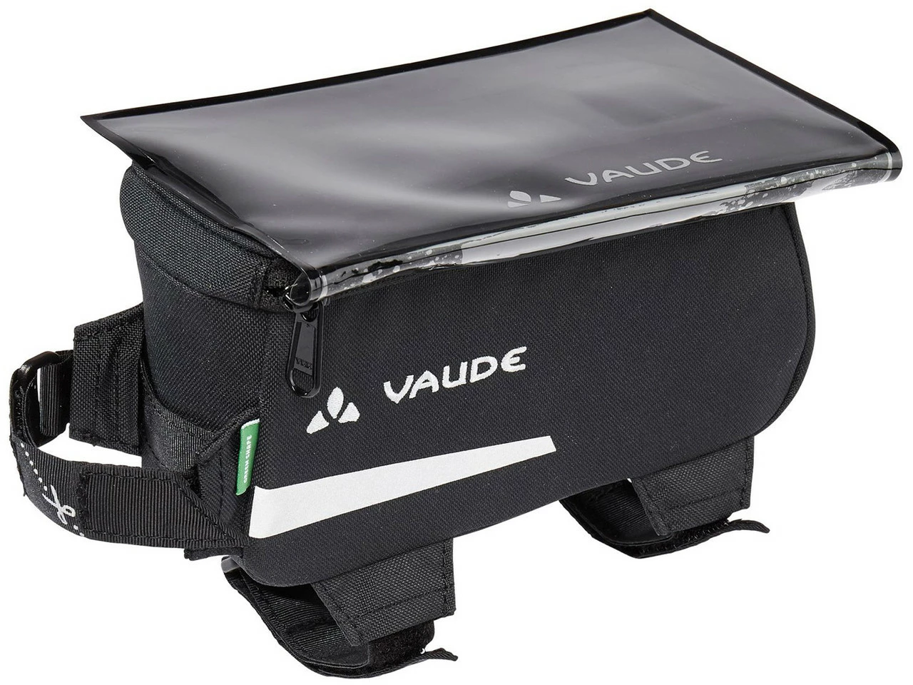 Die Carbo Guide Bag II Oberrohrtasche von VAUDE kommt mit einer Smartphone-Hülle durch die Du Dein Smartphone während der Fahrt bedienen kannst.